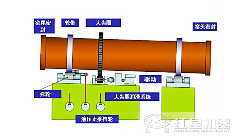 白灰回轉窯在工作過程中,白灰從窯尾筒體高端的下料管喂入窯筒體內,由于窯筒體的傾斜和緩緩地回轉,使白灰產生一個即沿著圓周方向翻滾,又沿著軸向從高溫向低端移動的復合運動,白灰在窯內通過分解,燒成等工藝過程,燒成熟料后從窯筒體的底端卸出。